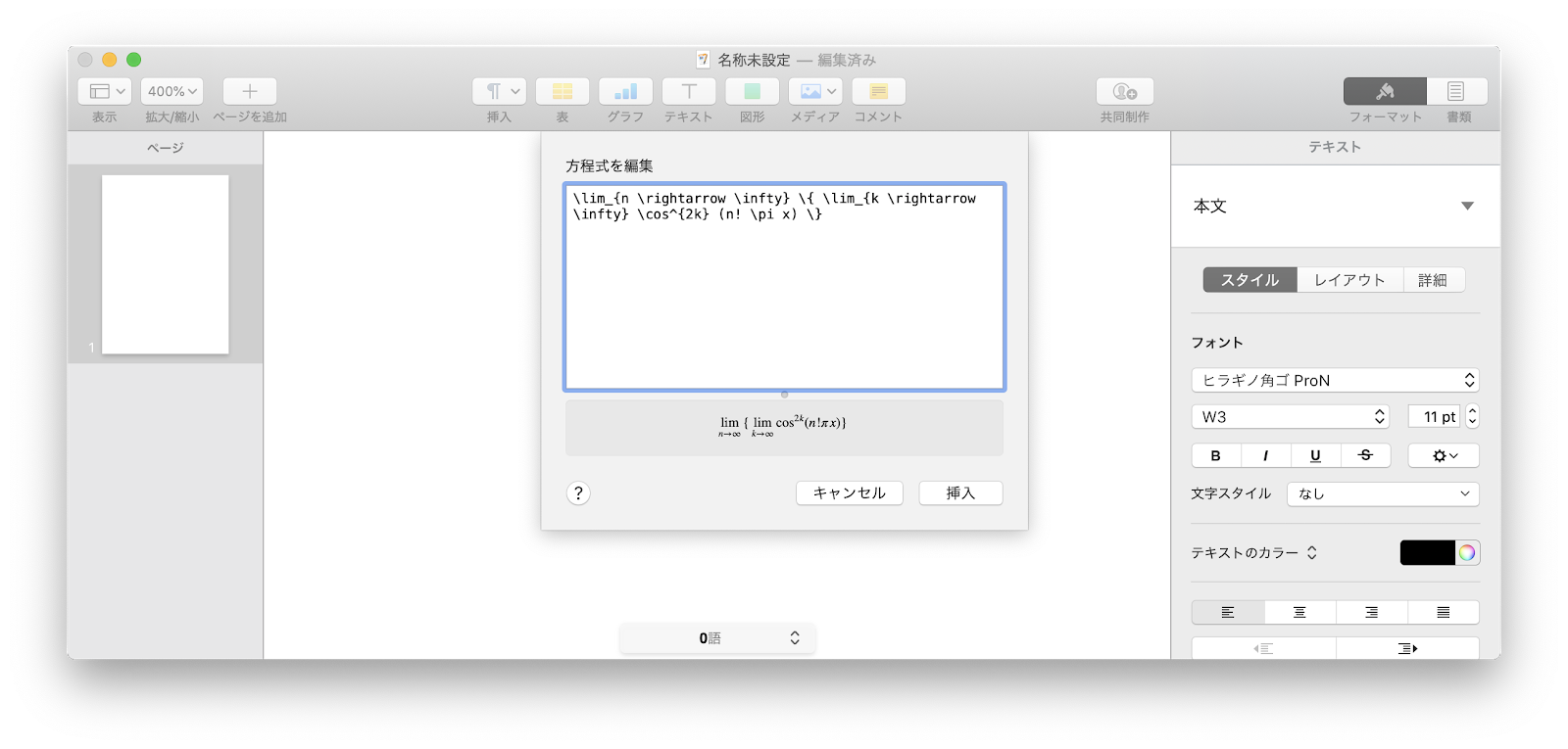 書けたら「挿入」ボタンをクリックすれば,数式を書類に入れ込むことができます.やってみましょう.