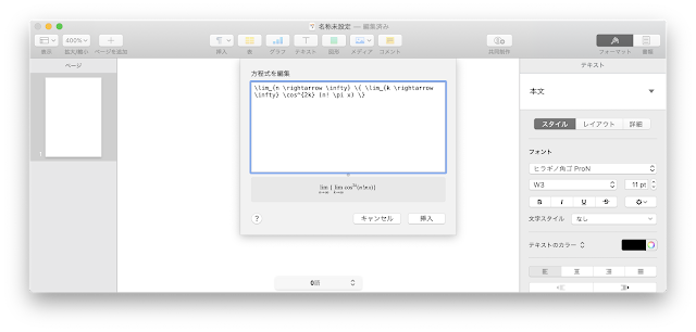 Macを使っている人は,PagesやNumbers, Keynoteでも,同様にLaTeX書式を用いて数式を表現することができます.Wordでの説明と同じように,数式を入れたいところにカーソルを持っていきます.「挿入」メニューから「方程式…」を選びましょう.