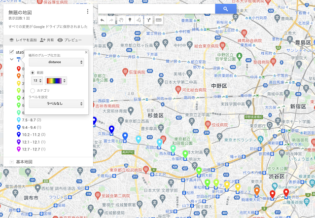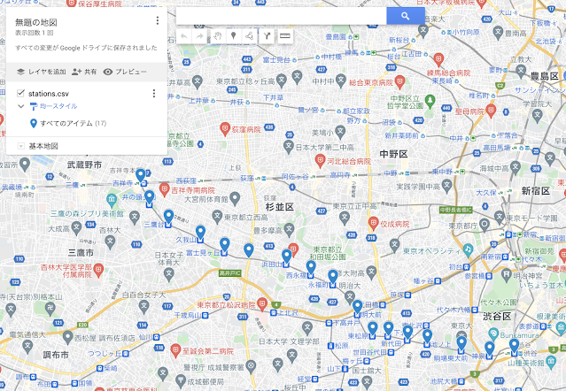Google My Maps に久しぶりにアクセスしたら,なんだかずいぶん進化していたので驚いた.ジオコーディングを自動でやってくれるので,試してみると,けっこうビックリする.学生にやらせたら「わーすごい」と素直にビックリしてた.まあ,Googleマップで検索するとピンポイントで探してくれるので,それをまとめてやってくれているというだけではあるが……